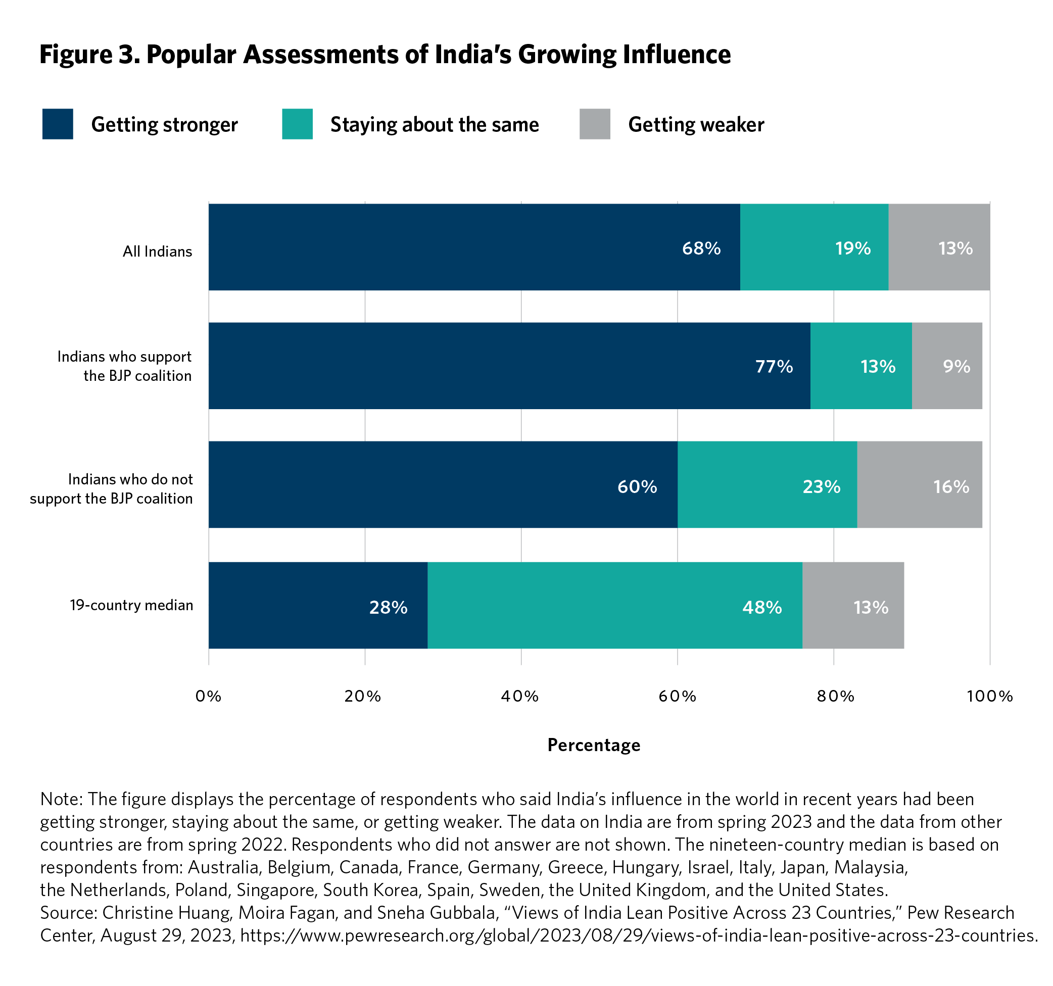 According to the 2023 Pew Global Attitudes Survey, nearly seven in ten Indians believed that their country’s global influence was getting stronger (see figure 3). Furthermore, eight in ten Indians had a favorable opinion of Modi’s performance as prime minister (with 55 percent holding a “very favorable” view). Not surprisingly, respondents who were supporters of the ruling BJP alliance were especially bullish on India’s global prospects, with 77 percent reporting the country’s influence as increasing. Even among those who did not support the Modi government, six in ten agreed with the notion that India’s status had risen.